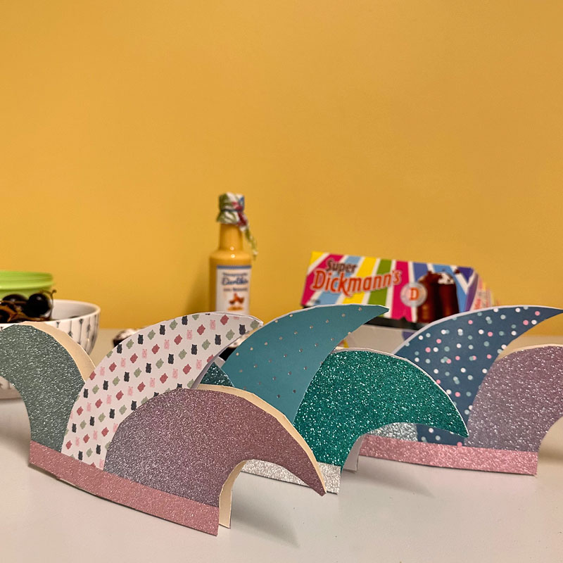 Diese hübschen Karnevalskappen aus Glitzerkarton kann man natürlich nicht essen, aber ich zeige sie Euch trotzdem. Eine meiner Nähschwestern hat sie mit dem Plotter geschnitten und gebastelt und dann waren sie Tischdeko unserers karnevalistischen Nähabends. In der Korn-Flasche da auf dem Bild befindet sich übrigens der leckere Heiße Liebe Likör.