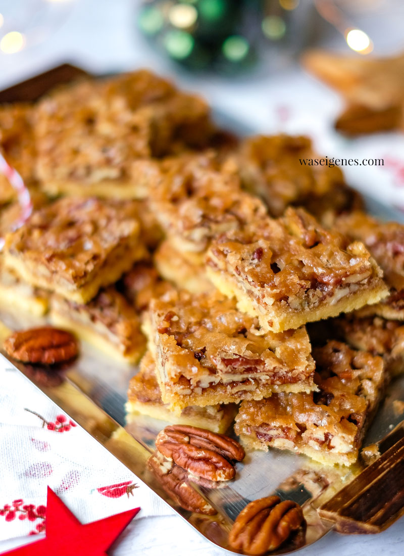 Herzlich willkommen in unserer Weihnachtsküche! Heute teile ich mit Euch das Rezept für wunderbare Pekannuss-Schnitten, die ein bisschen an Nussecken erinnern, aber m.E. etwas schneller von der Hand gehen und recht flott warm und knusprig, nussig und süß auf der Arbeitsplatte stehen. Sie müssen dann nur noch abkühlen, in kleine Quadrate oder Rechtecke geschnitten und dürfen dann zu einer Tasse Kaffee genossen werden.