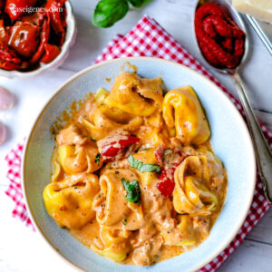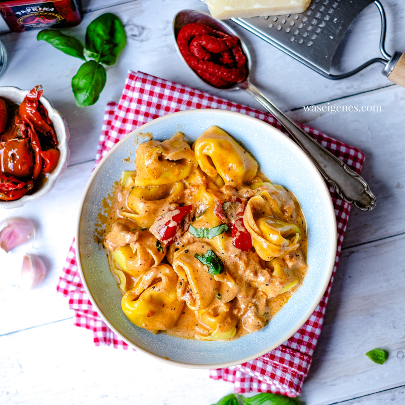 Tortellini, Nudeln, Spätzle, Gnocchi: Die Soße schmeckt einfach zu allem gut. Oder umgekehrt: Zu dieser Soße schmeckt einfach alles gut. :-) Hier zeige ich Euch das Rezept mit Tortellini. Lecker! Ich habe es aber auch schon mit Fussili und Gnocchi kombiniert. Alles kann, nichts muss.