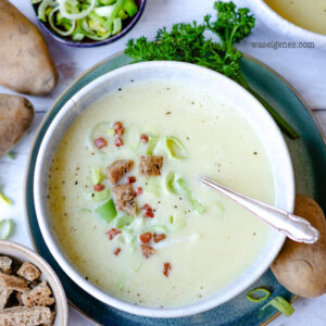 Ich habe heute eine cremig pürierte Kartoffel-Lauch-Suppe für Euch. Der Lauch oder, wie ich ihn nenne: Der Porree kommt wohl in den Thermomix, als auch als Garnitur zum Schluss in die Suppenschalen.