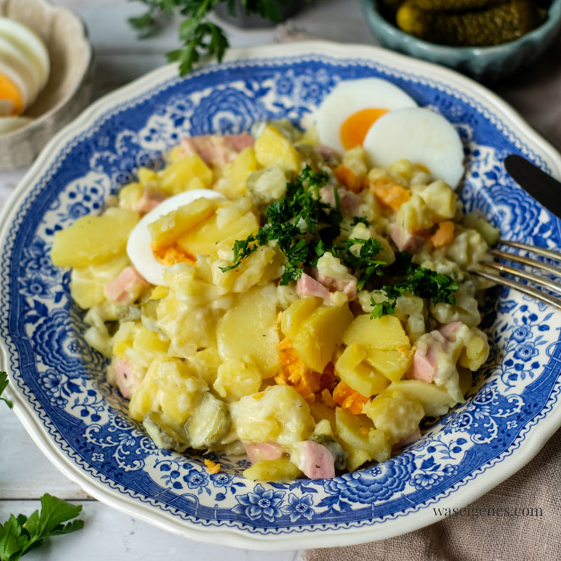- Zum Schluss die Mayonnaise vorsichtig unter den Salat ziehen und mit Salz & Pfeffer abschmecken. Frisch gehackte Petersilie rundet diesen cremig-würzigen Salat ab. Lasst es Euch schmecken! :-)