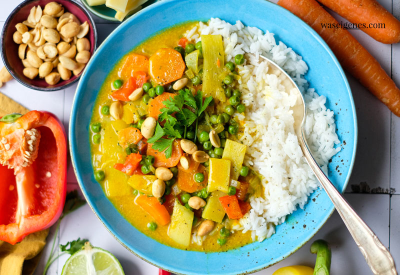 Mein Gemüse-Curry mit Kokosmilch und knackigem Gemüse, mit gesalzenen Erdnüssen und Reis ist ein fantastisches Mittagessen! Es steht in gut und gerne 25 – 30 Minuten auf dem Tisch und eignet sich auch hervorragend zum Reste-Wegkochen, denn bei der Auswahl des Gemüses dürft Ihr Eurer Fantasie freien Lauf lassen.