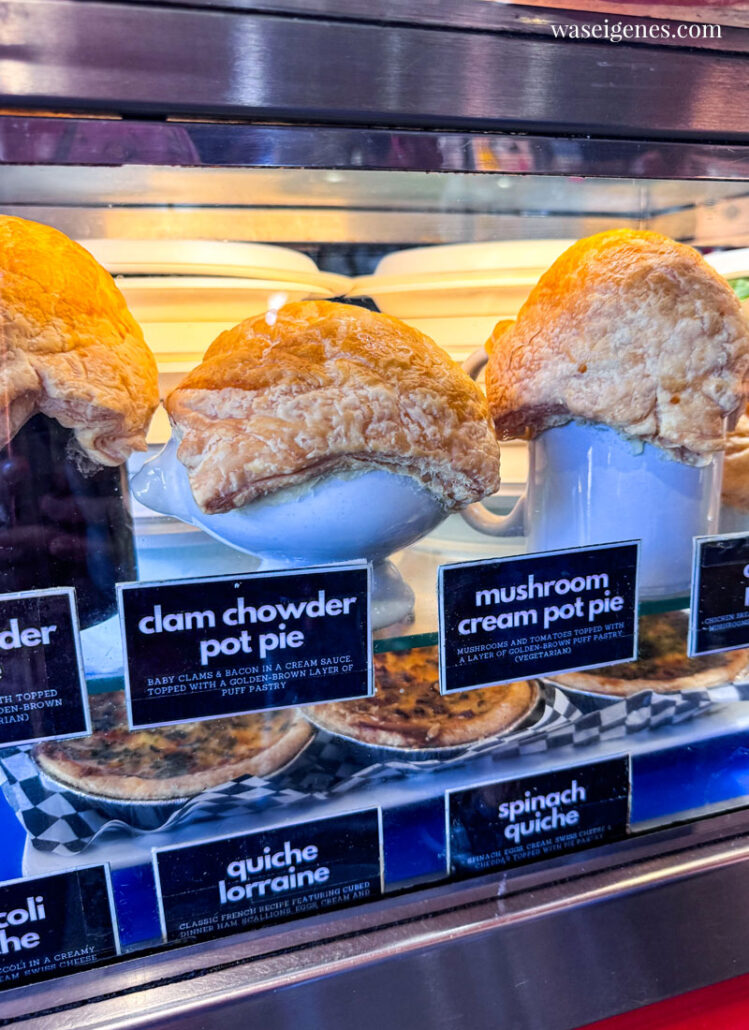 Lust auf einen Clam Chowder Pie – eine überbackene Muschelsuppe? Oder lieber einen Mushroom Cream Pot Pie – Überbackene Pilz-Sahne-Topf. Hätte ich vorher geahnt, was uns in der Markthalle alles erwartet, ich hätte morgens nicht gefrühstückt.