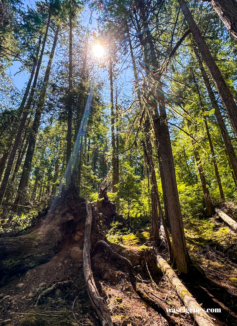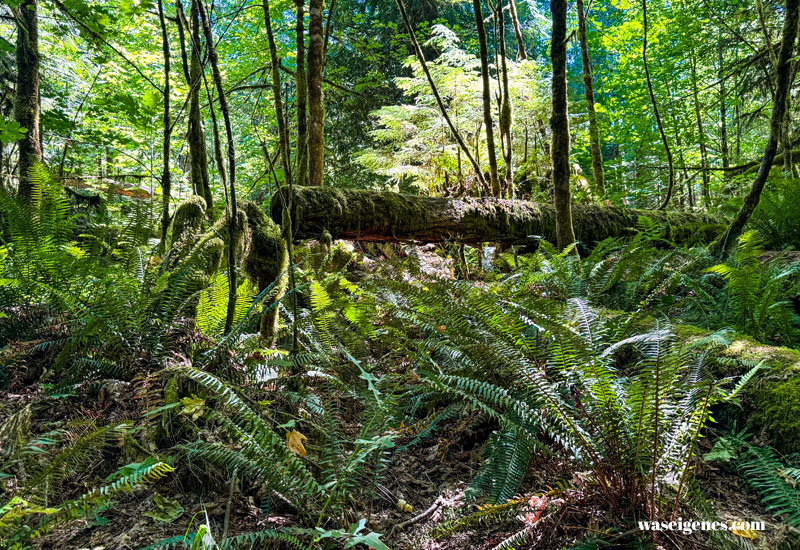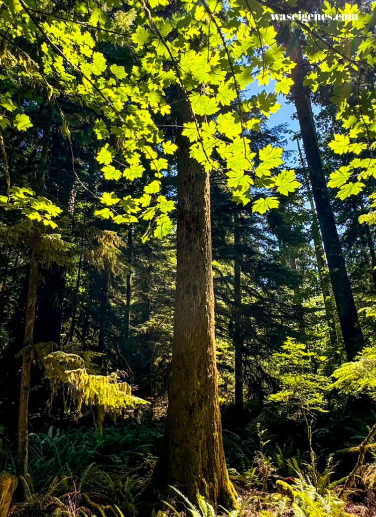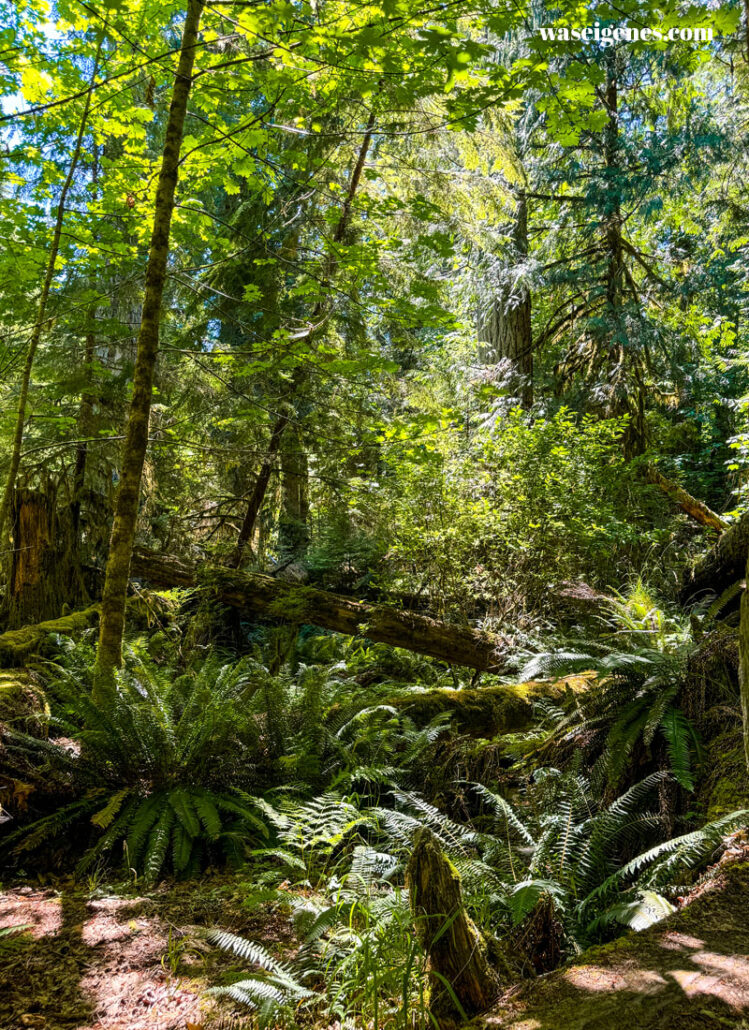 Hier stehen 800 Jahre alte riesigen Douglasien, Riesentannen und Riesenlebensbäume. Einfach nur toll und wenn man noch oben schaut, dann versteht man, warum dieser Ort Cathedral Grove heißt.