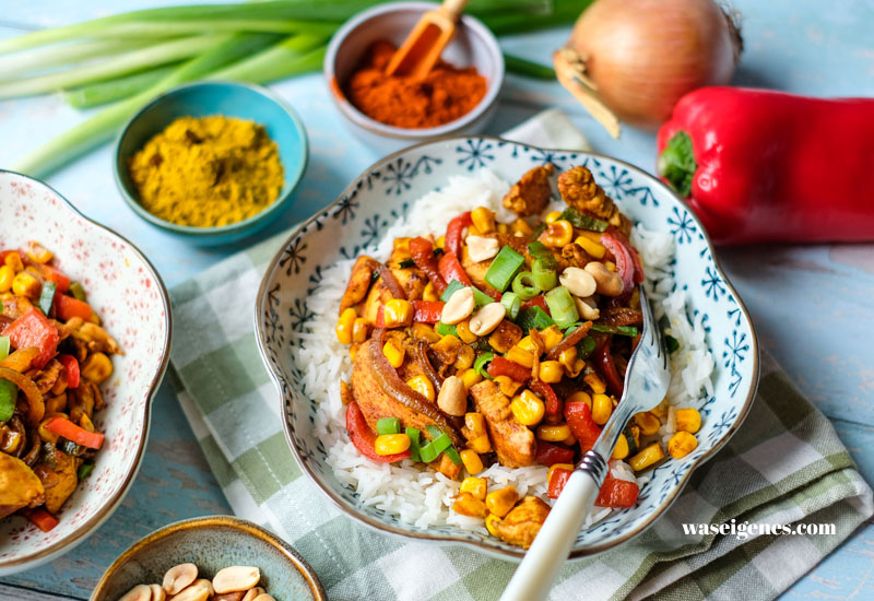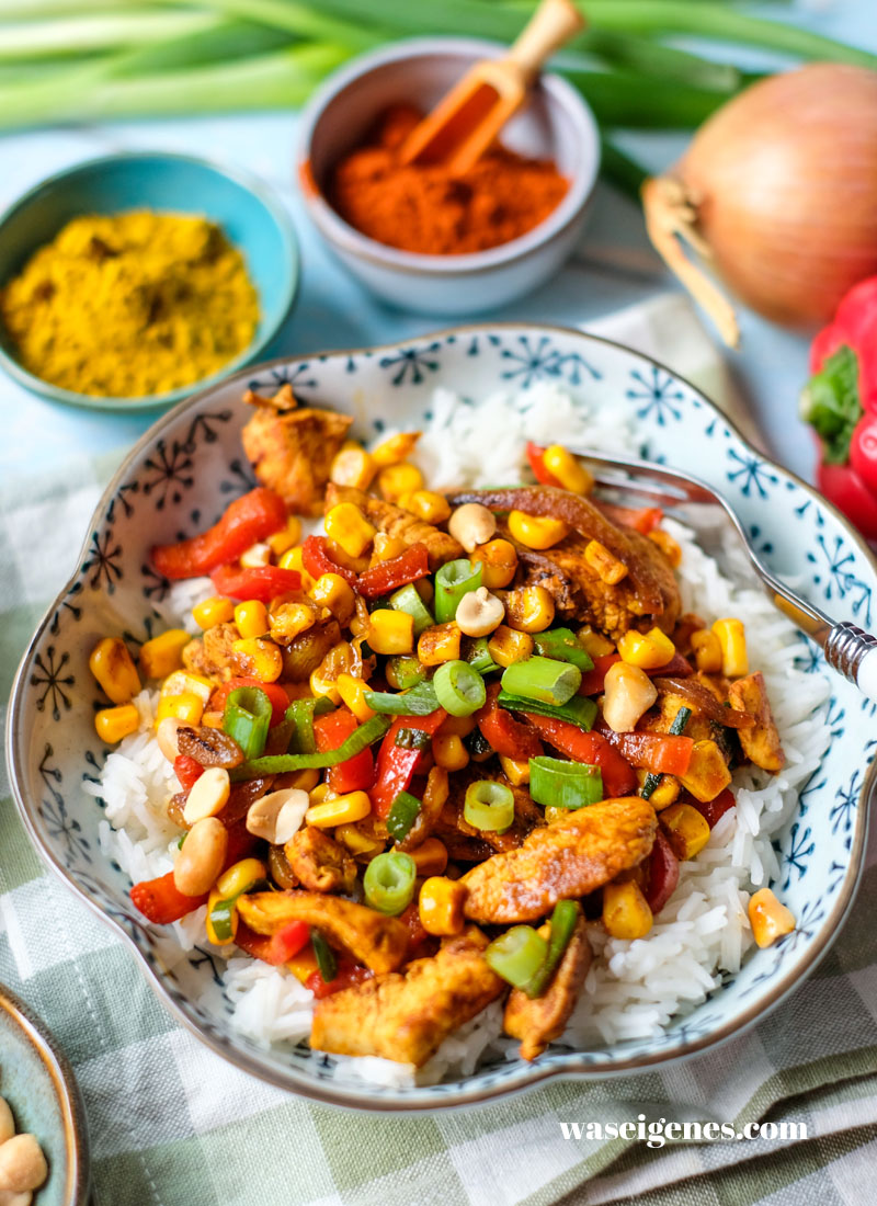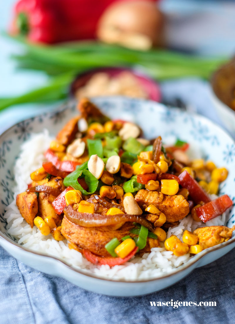 Wenn es am Abend, nach getaner Arbeit, nach einem langen Tag, schnell gehen muss, man aber auch ein leckeres und vor allem sättigendes Gericht auf den Tisch stellen mag, dann ist dieses Rezept hier genau richtig für Euch: Meine würzige Hähnchen-Gemüsepfanne mit knackfrischer Paprika, Lauchzwiebeln, Mais und Erdnüssen ist ruck zuck gekocht und während das Gemüse mit den Hähnchenbruststreifen in der Pfanne brutzelt, blubbert nebenan im Topf der Reis.