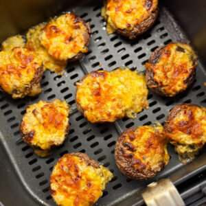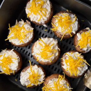 - Die gefüllten Champignons in den Garkorb der Heißtluftfritteuse legen und bei 190° Grad ca. 15 Minuten backen.
