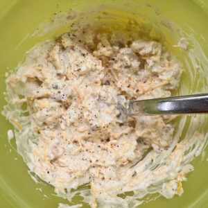 - Die saure Sahne (oder Schmand), den geriebenen Cheddar, Salz und Pfeffer und eine gute Portion Muskat hinzufügen und gut verrühren.