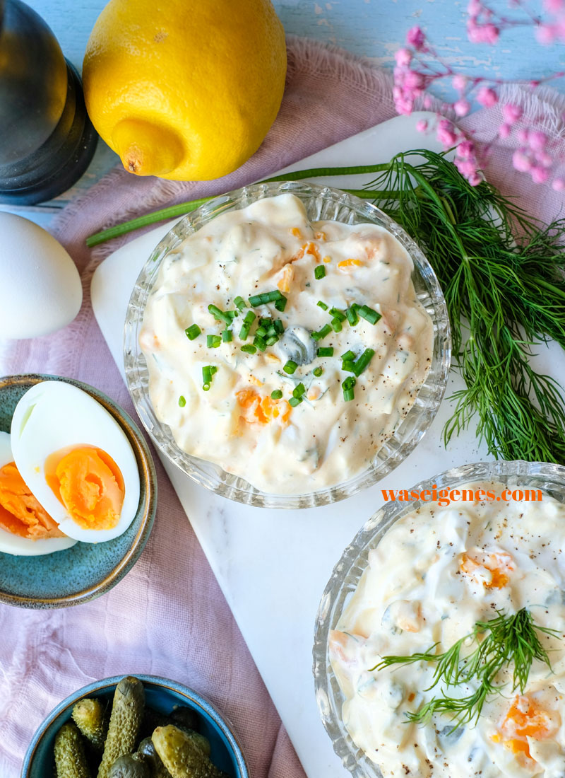 Der Eiersalat schmeckt köstlich zu Kartoffeln und Fisch und ganz besonders lecker schmeckt er auf Brot, auf Baguette, auf Toast. Und damit ist er ein beliebter Kandidat für das Frühstücks- oder Brunchbuffet … wir gesagt, die Osterfeiertage sind nicht mehr fern.