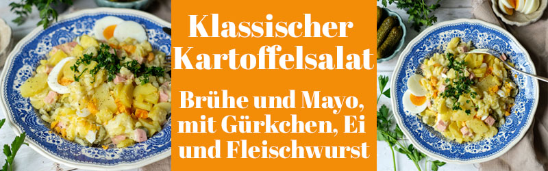 REZEPT: Kartoffelsalat mit Brühe und Mayo, mit Gürkchen, Ei und Fleischwurst