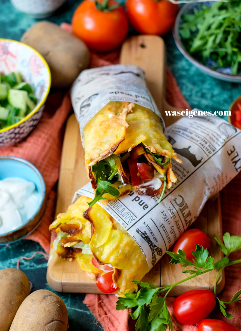 - Die beiden Kartoffel-Wraps aufrollen, in Butterbrotpapier wickeln und sofort genießen!