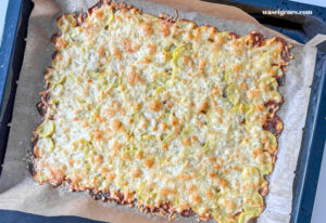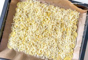 Die Kartoffeln werden zunächst geschält und dann in ganz dünne Scheiben gehobelt. Auf ein mit Backpapier ausgelegtem Backblech werden die Scheiben dann leicht überlappend ausgelegt und mit geraspeltem Käse bestreut. Der Käse fungiert später als “Kleber”, der die Kartoffelplatte zusammenhält.