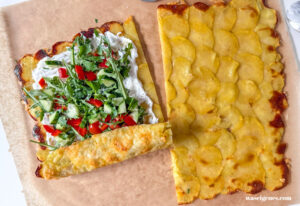 Nun ersetzten wir einfach das Fladenbrot mit einer dünnen, knusprigen Schicht überbackener Kartoffelscheiben.