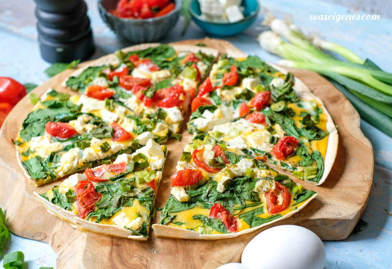 Die Zubereitung ist sowas von kinderleicht. Lediglich das Gemüse muss geputzt und in Stücke geschnitten werden – der Salat gewaschen, die Frühlingszwiebeln und Kirschtomaten in Ringe, Würfel oder Scheiben geschnitten werden. Den Feta können wir ganz einfach mit den Händen zerbröseln. Und dann werden nur noch flott die Eier verquirlt und gut gewürzt… das alles kommt auf den Tortilla-Fladen und ab damit in den Ofen.