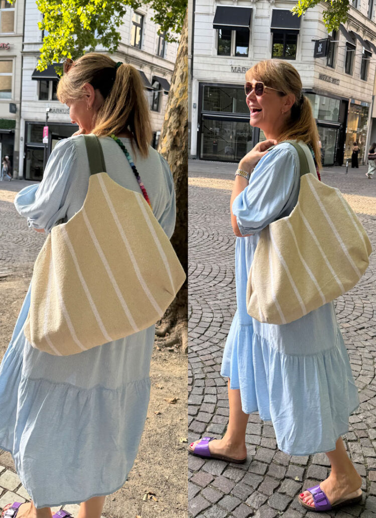 Ich habe einen neuen Heinrich genäht, der schon mit mir durch Köln spazieren durfte. Der Stoff ist toll, das ist Grob-Köper, der hat eine feste Gewebestruktur, ist beige mit weißen Streifen, da denke ich an Strand und Urlaub, deswegen ist er mein Sommer-Liebling. Ich habe ihn schon bei Insta in einer Story {klick} gezeigt und habe daraufhin mal wieder viele liebe Nachrichten von anderen Heinrich-Verrückten bekommen. Freut mich immer riesig! ;-)