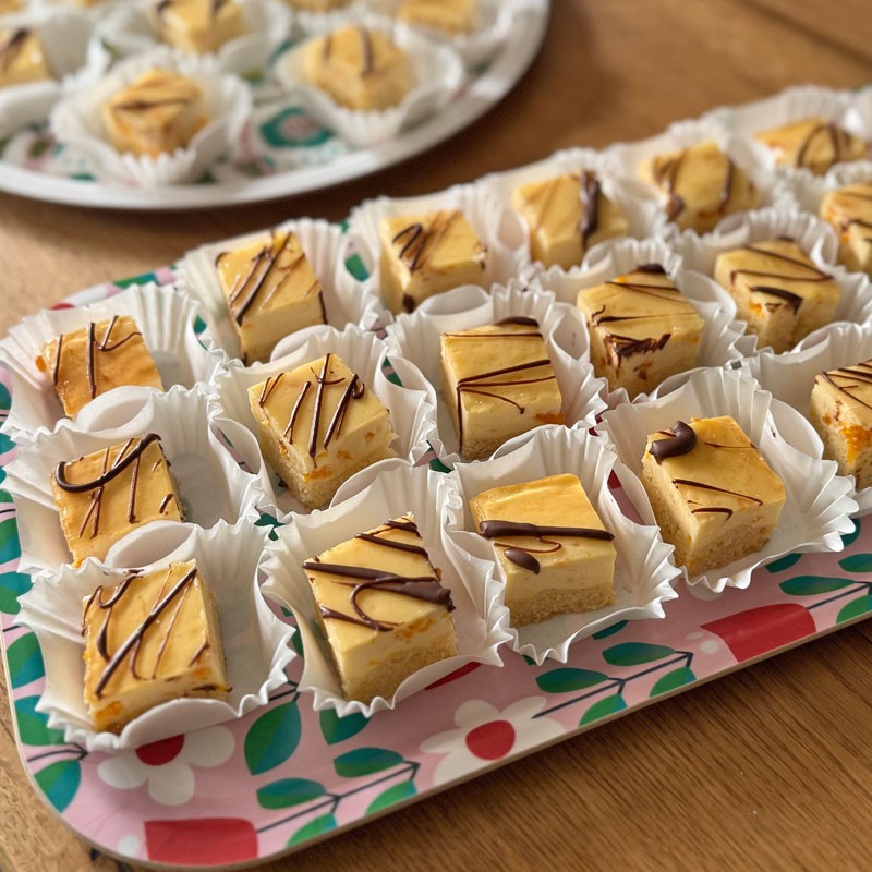 Dafür habe ich einfach meinen Schmetterling-Käsekuchen gebacken, habe den Backrahmen dann aber etwas größer eingestellt, so dass der Kuchen im Ganzen breiter und flacher gebacken wurde. Dann habe ich eine Dose Mandarinchen (statt zwei Dosen) klein gehackt (nicht die Dose, die Mandarinchen!) und direkt unter die Käse-Creme gehoben. Nach dem Backen habe ich noch geschmolzene Kuvertüre drüber gesprenkelt, denn ich fand, dass der Kuchen so fad aussah. Die Schmetterlinge fehlten ja. Und dann habe ich ihn in kleine Würfel geschnitten und in die kleinen quadratischen Muffin-Förmchen gestellt. Kam gut an. :-)