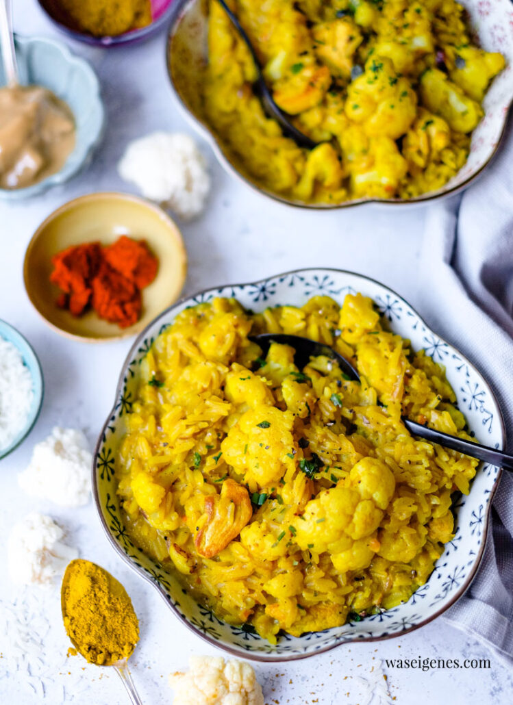 Zum REZEPT -> Blumenkohl-Reis-Pfanne mit Hähnchen und viel Curry↗︎