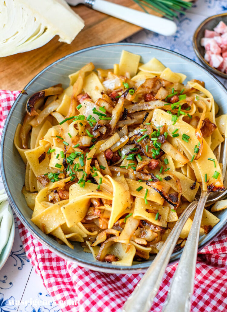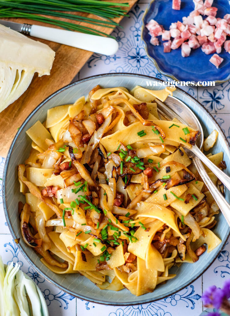 Krautnudeln mit Speck sind so genial einfach, weil sie keine ausgefallenen Zutaten und kein besonderes Küchentalent brauchen. Einen Topf für die Nudeln, eine Pfanne für den Weißkohl, Zwiebeln, Speck, ein paar Gewürze und Handgriffe und fertig ist das tolle Essen, das satt und glücklich macht.
