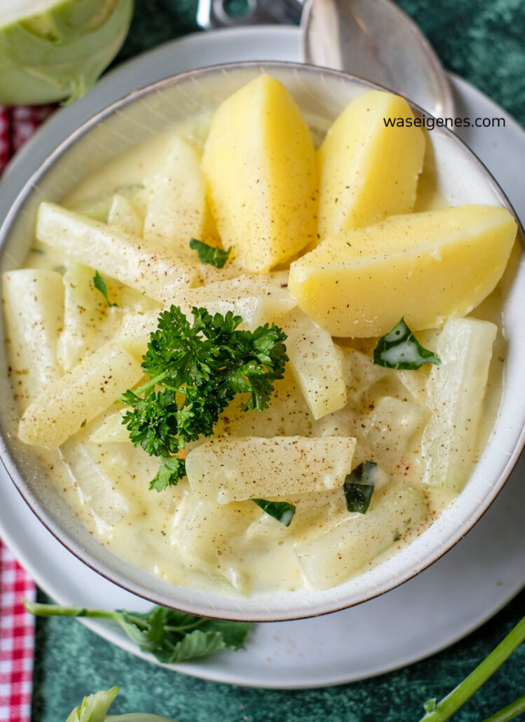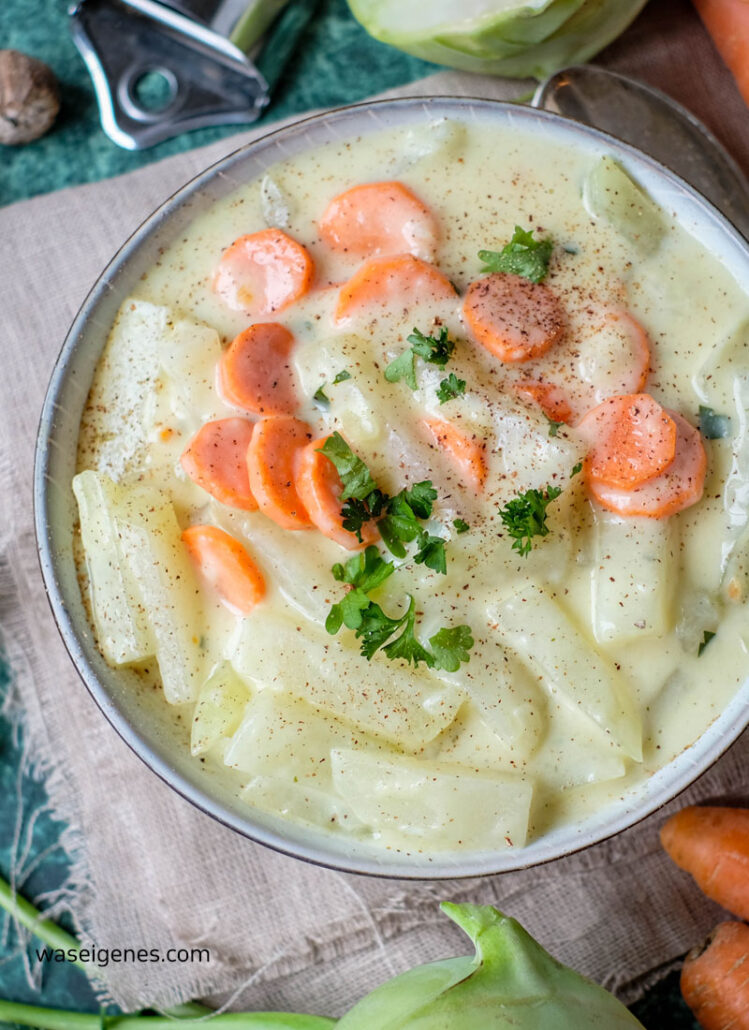 Kohlrabi in heller Soße ist ein Multitalent! Mit Möhren und Kartoffeln ist es schon ein tolles Hauptgericht und obendrein ein leckerer, cremiger und vegetarischer Eintopf.