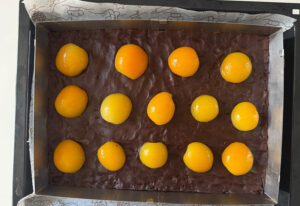 - Darauf die Aprikosenhälften mit der Schnittstelle nach unten legen.