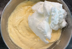 - Den Quark mit dem Zucker, den Eigelben und dem Puddingpulver zu einer glatten Creme mixen. Dann die Butter einfließen lassen und gut verrühren und zum Schluss das steif geschlagene Eiweiß unterheben.