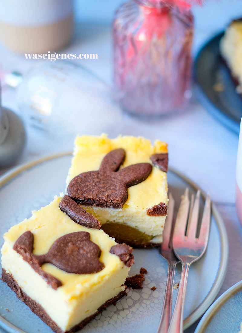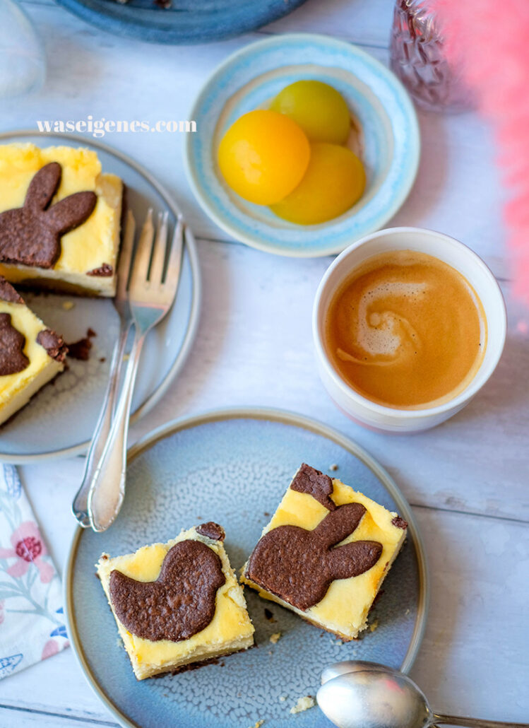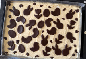 - Den restlichen Schokoteig auf einer bemehlten Arbeitsfläche ausrollen und mit Keksausstechern Oster-Motive ausstechen und diese auf der Quarkschicht verteilen.