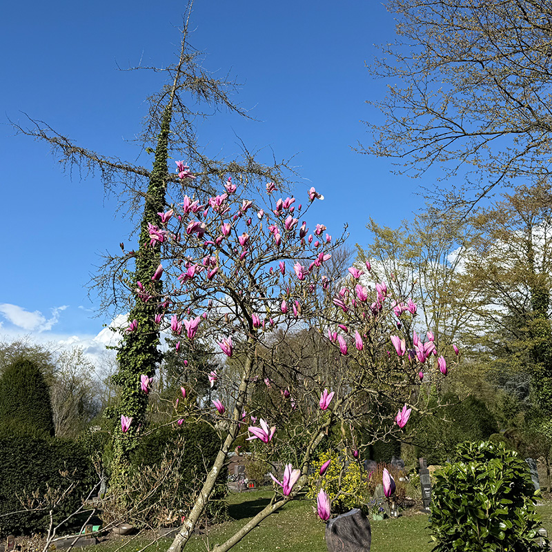 Hmpf. Das zeigt, wo wir gerade stehen. Auch ich schaue mir Bilder und Videos bei Instagram mittlerweile anders an und bin misstrauischer. Hier, zu diesem Foto kann ich nur sagen: Ich war im Bauernladen, habe Blumen, Äpfel und Möhren gekauft und beim Rausgehen flott dieses Bild gemacht. Der Baum steht da jedes Jahr so. Hier z.B. 2022 – klick oder hier 2019 – klick.