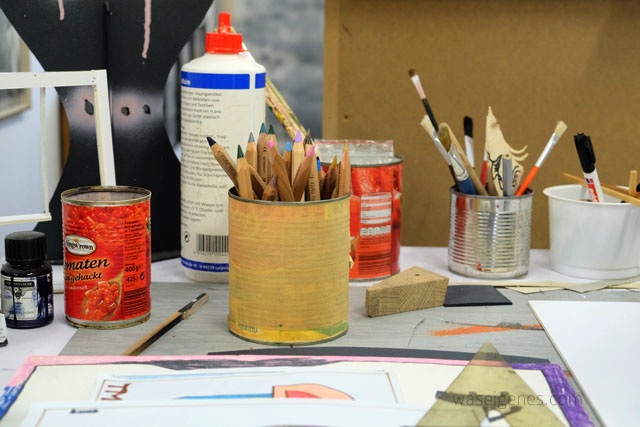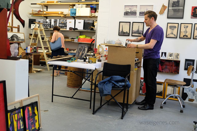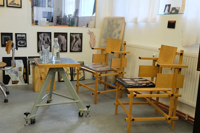 Während er Kaffee kochte, durften wir durch sein Atelier laufen, gucken, knipsen und Fragen stellen. Sein Atelier befindet sich in einem alten, unter Denkmalschutz stehendem Gebäude mit dem Namen Atelierhaus Frühauf, in dem noch viele weitere Künstler ihre eigenen Räumlichkeiten haben. Ich möchte da einziehen und dort nähen und basteln und schreiben.