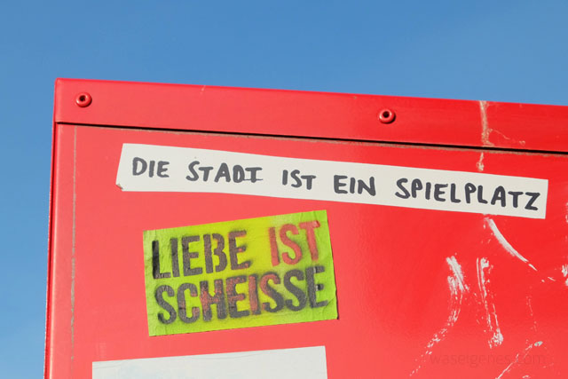 Genug der schönen Künste: Weiter ging es, an wundervollen Aufforderungen- Sei hemmungslos glücklich!- an bemalten Häusern, an hängenden Schuhen, an Menschen und Cafés vorbei.