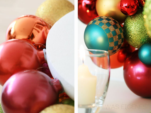 Inspiriert von hier und hier und hier, habe ich dieses Jahr selbst einmal die Heissklebepistole zur Hand genommen und mir ‘was eigenes’ gebastelt. Einen Weihnachtskugelkranz zum selber machen mit viiielen bunten Weihnachtskugeln:
