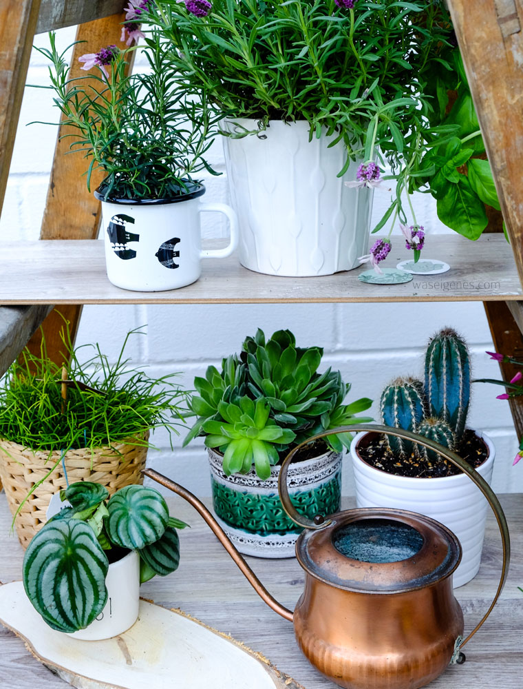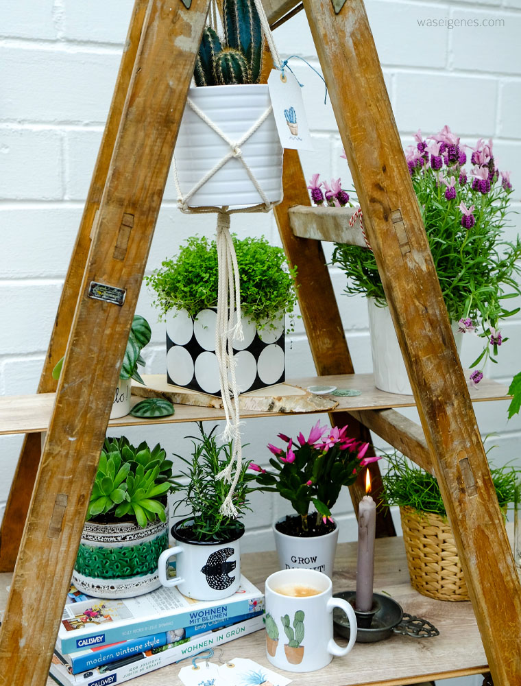 Nun denkt Ihr sicher, wo und wie hat die sich denn ihren jungle da gebaut? Ganz einfach: ich hab’s nachgemacht. Einen jungle im Wohnzimmer oder in unserer Küche kann ich Euch nicht zeigen, denn beide Räume sind zu düster, um dort freundliche (Instagam- und Pinterest-taugliche) Bilder zu machen. Das gleiche gilt für mein Kellerbüro. Und dann sah ich Jules tolles Foto mit der Leiter und dachte- Irre! Und eine olle Leiter haste auch auf der Terrasse stehen!