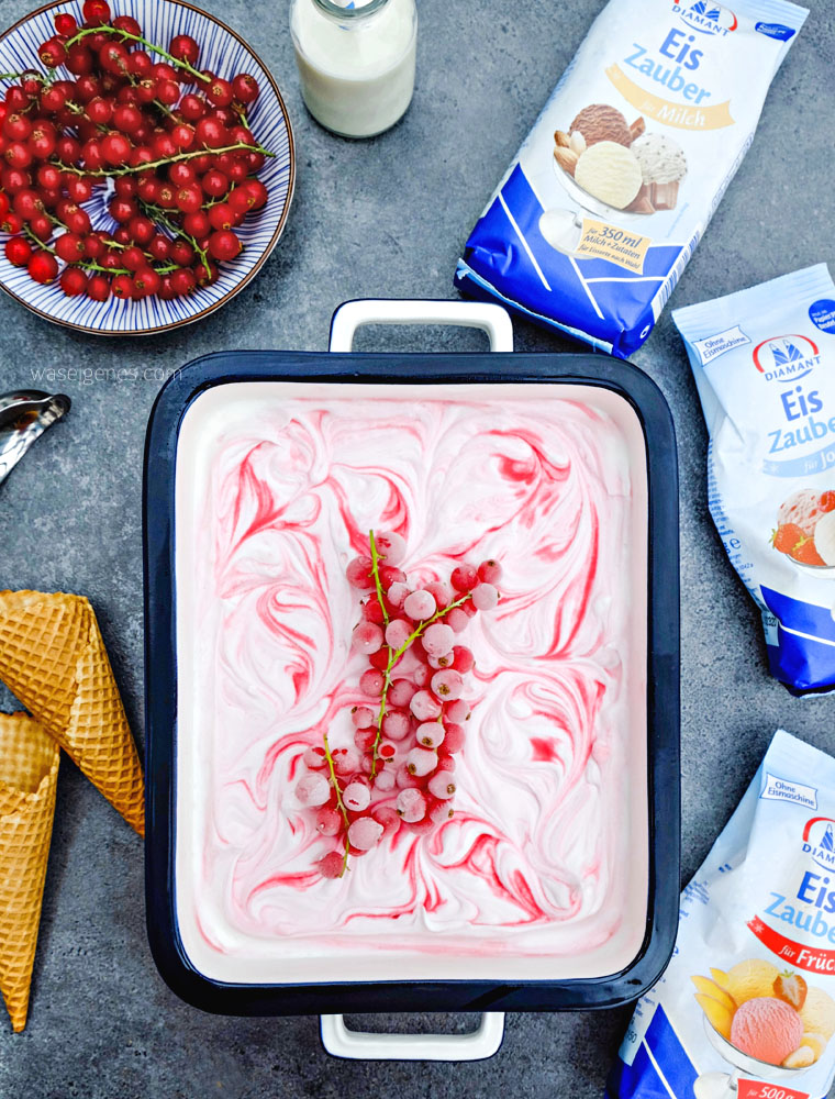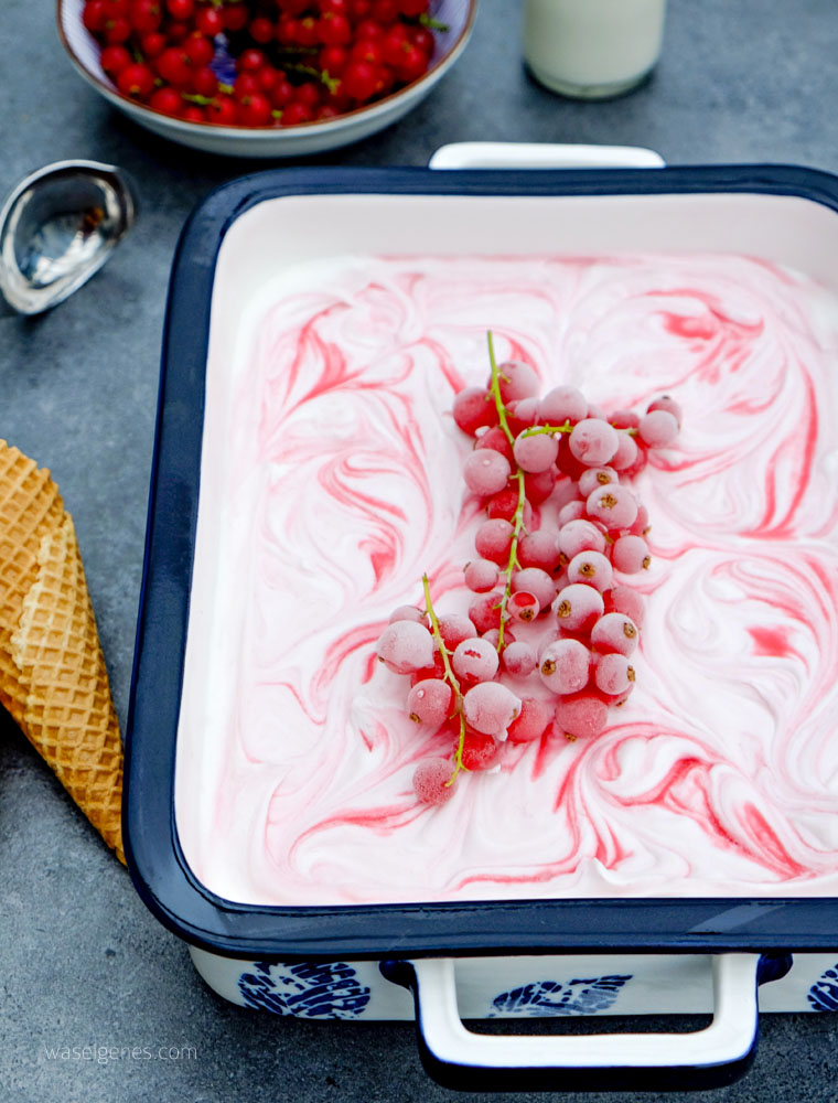 Die Eismasse in eine Auflaufform kippen, darauf den kalten Johannisbeer-Sud geben und mit einem Stäbchen vermengen. Entweder komplett, bis eine rosa Eiscreme entsteht oder vorsichtig, so dass man den Swirl noch sieht.
