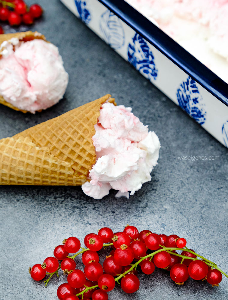 Gezaubert habe ich eine köstliche Buttermilch-Johannisbeer-Eiscreme und zwar so: (vorher muss ich aber noch fragen: schreiben wir Eiscreme oder Eiskrem? Letzteres sieht seltsam aus, ist aber laut Duden erlaubt. Ich entscheide mich für Eiscreme.):