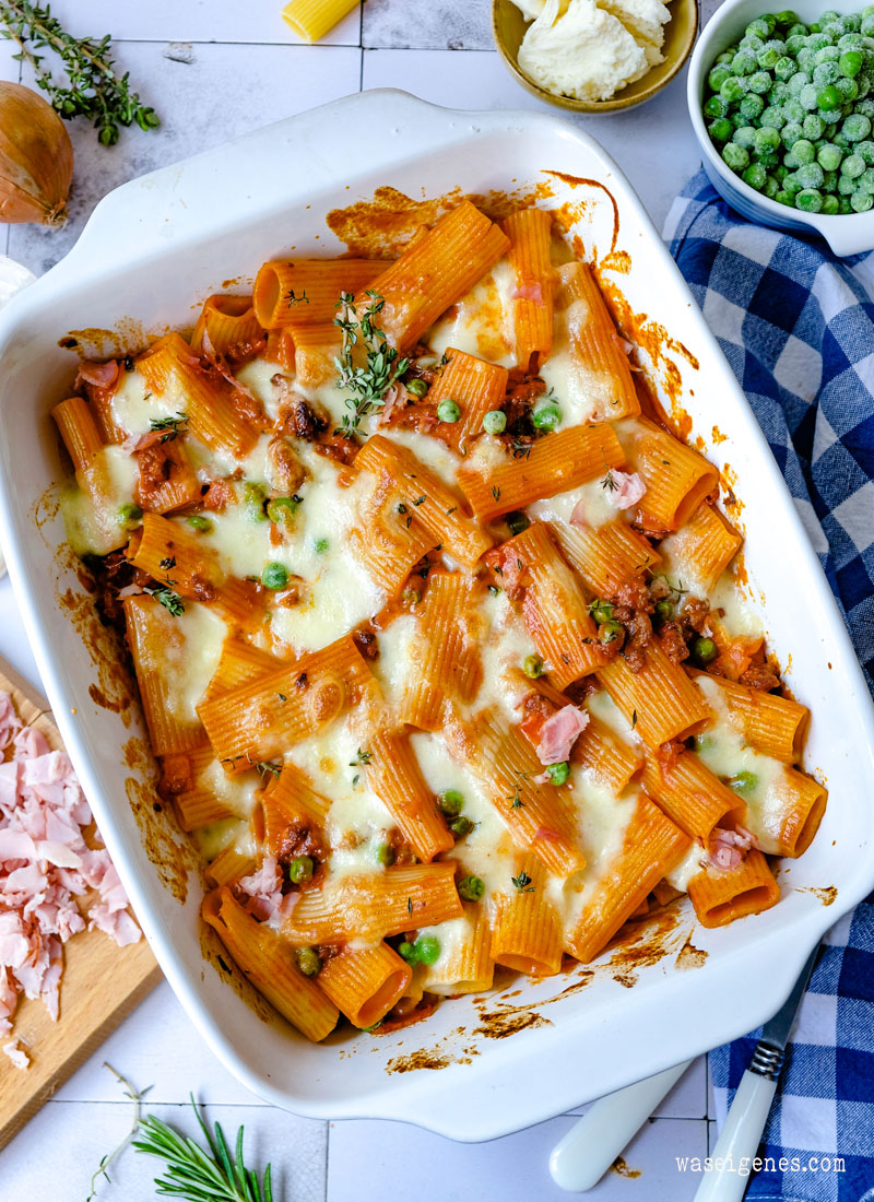 Meine Rigatoni al forno – ein wunderbar aromatisch-würziges Nudelgericht aus dem Ofen – gehen einfacher, als man denkt und schmecken wie beim Italiener! In der ofenfesten Form werden gekochte Nudeln, eine cremige Hackfleisch-Tomaten-Soße, gekochter Schinken und Erbsen aus dem Tiefkühlfach vermischt und das alles wird dann mit Mozzarella im Backofen überbacken. Ihr solltet Brot im Haus haben, denn diese Soße bringt Euch um den Verstand.