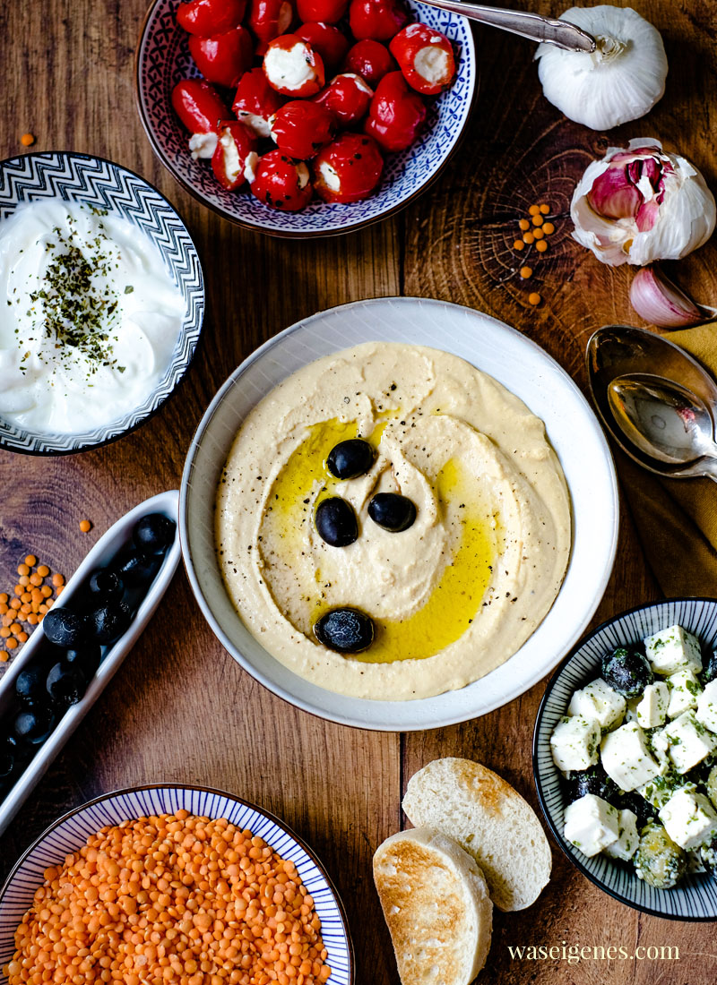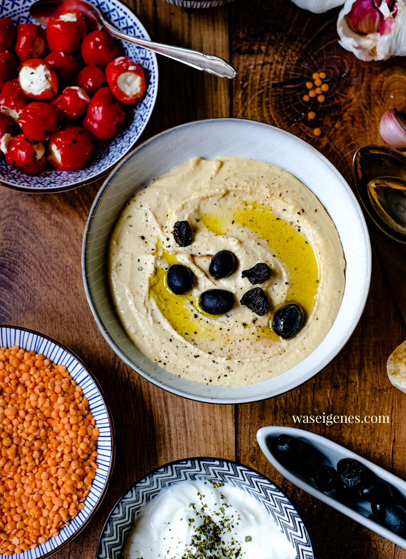 Hummus schmeckt einfach köstlich auf geröstetem Brot, zu Crackern und Gemüse-Sticks, zu Fladenbrot und Ofengemüse. Im Sommer schmeckt er zu Grillgut und gegrilltem Gemüse, im Winter zu … ach, einfach allem. Hummus peppt auch jedes Partybuffet auf. Wollen wir hoffen, dass wir uns im Herbst mal wieder Gedanken zu Partybuffets, Partyoutfits und überhaupt… zu Parties machen können und dürfen!
