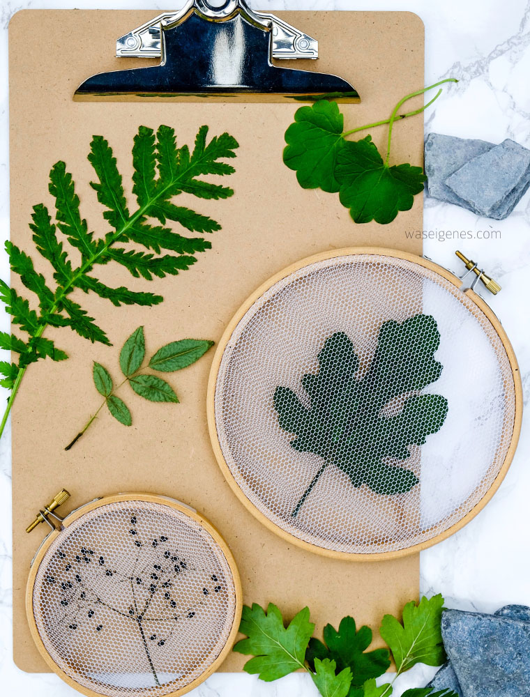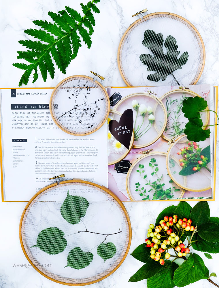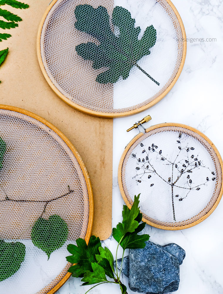 Von meiner morgendlichen Mollie-Runde brachte ich Blätter mit, trocknete diese zwischen Küchentüchern und dicken Schinken und spannte sie ein paar Tage später zwischen Tüll in die Stickrahmen. Fee spannt in ihrem Buch übrigens robuste Blumen und Pflanzen ein. Sieht hübscher aus, als meine Deko, ist aber nicht von langer Dauer, denn die Pflanzen verwelken ja irgendwann.