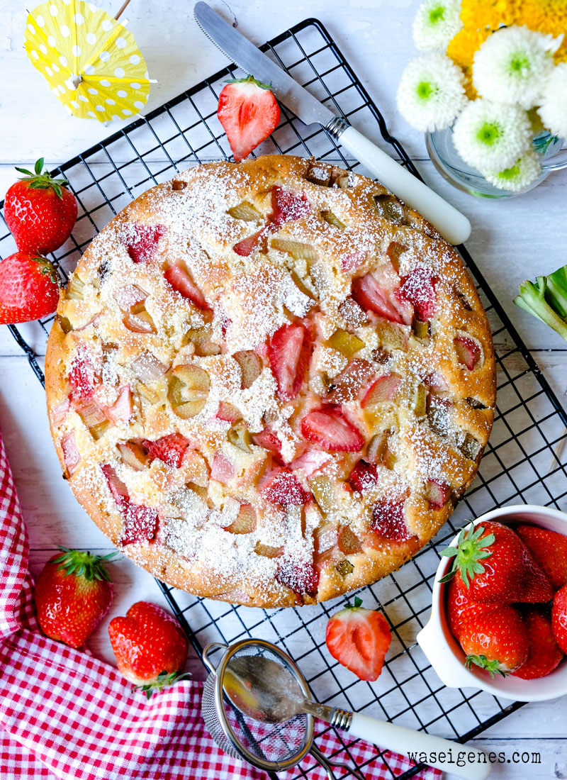 Erdbeeren und Rhabarber sind für mich die Frühlingsfrüchte schlechthin. Von ihrem unverwechselbar fein-säuerlichem oder angenehm süßem Geschmack kann ich nicht genug bekommen. Die beiden (und ja, ich weiß Rhabarber ist eigentlichen ein Gemüse) harmonieren einfach ganz wunderbar und deswegen habe ich mit ihnen einen leckeren saftig-fluffigen und fruchtig-süßen Rhabarber-Erdbeer-Joghurt-Kuchen gebacken. Den solltet Ihr auf jeden Fall einmal probieren. Heute gibt’s hier das Rezept und ein Gewinnspiel auf meinem Instagram Kanal.